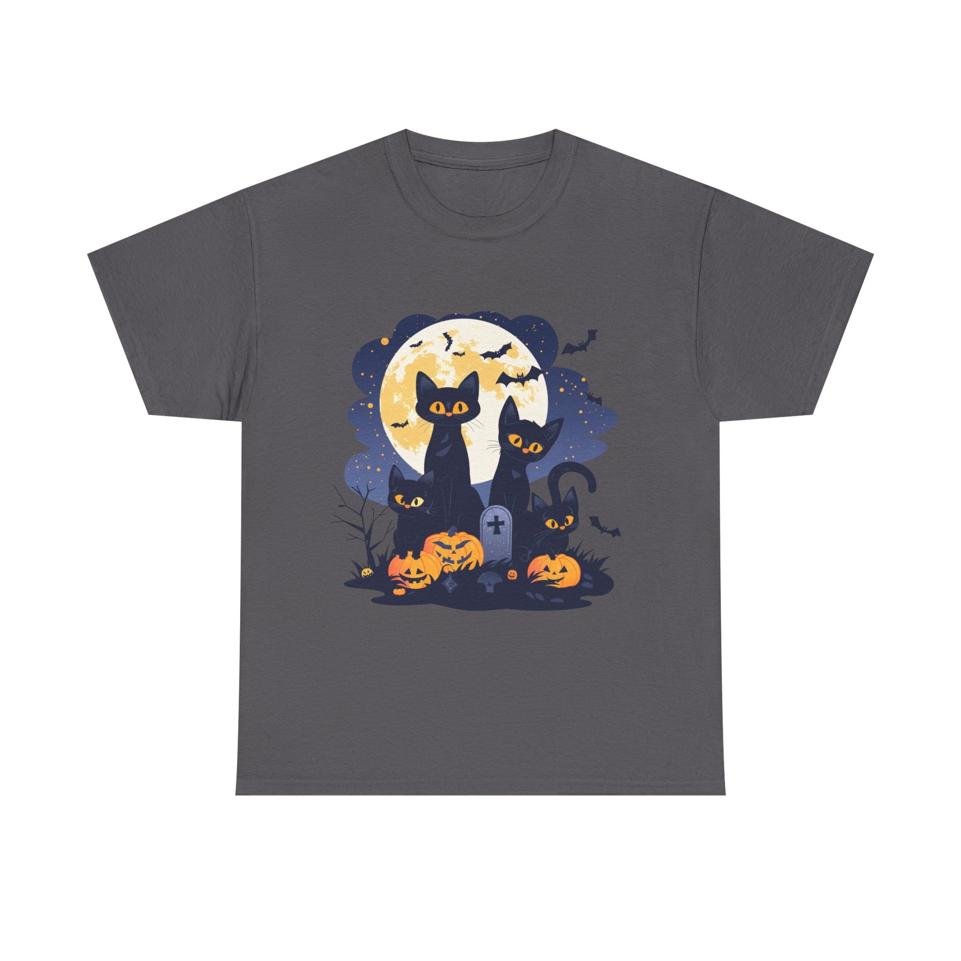 Embrace the spooky season with this enchanting Unisex Heavy Cotton Tee featuring a whimsical design of playful cats, pumpkins, and a full moon. Perfect for Halloween, it brings a delightful charm to your wardrobe. Whether you're attending a festive gathering, heading to a costume party, or simply enjoying a cozy night at home, this tee adds an element of fun and creativity to your look. Ideal for cat lovers and Halloween enthusiasts, this shirt is a must-have for anyone who enjoys celebrating the fall season. Wear it to express your unique style at autumn festivals, themed events, or casual outings with friends!
