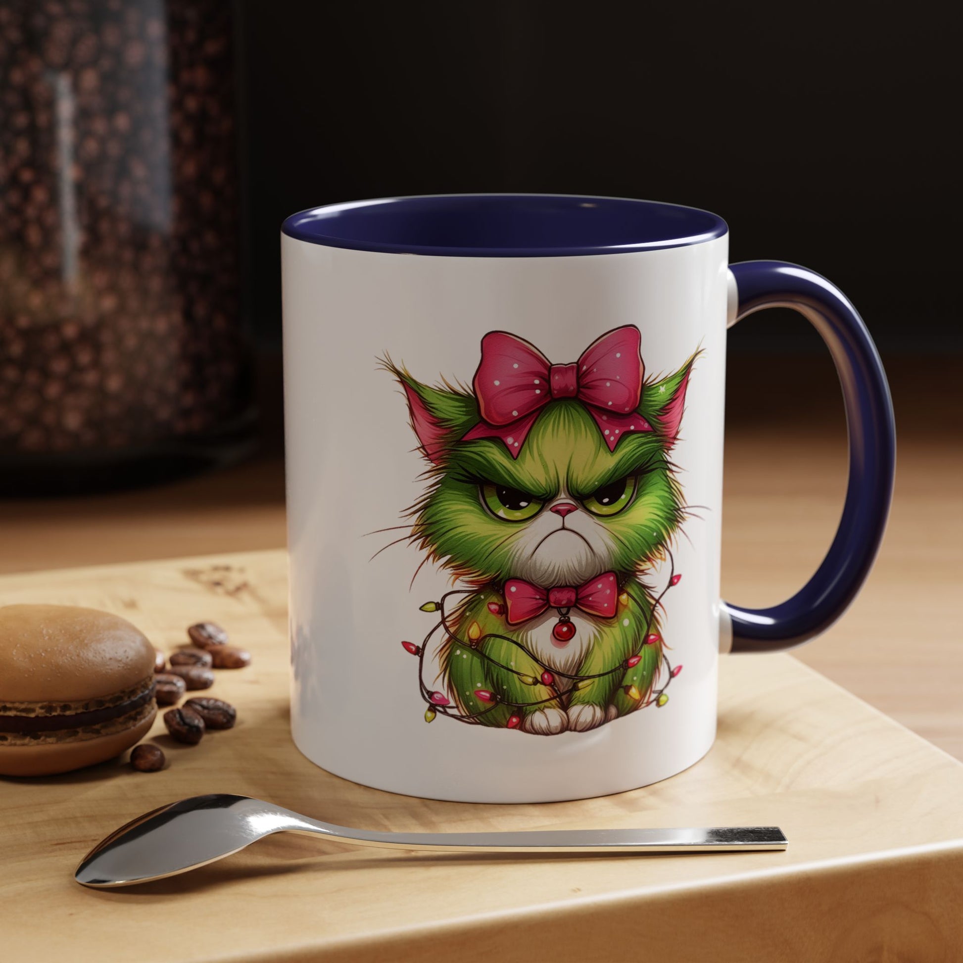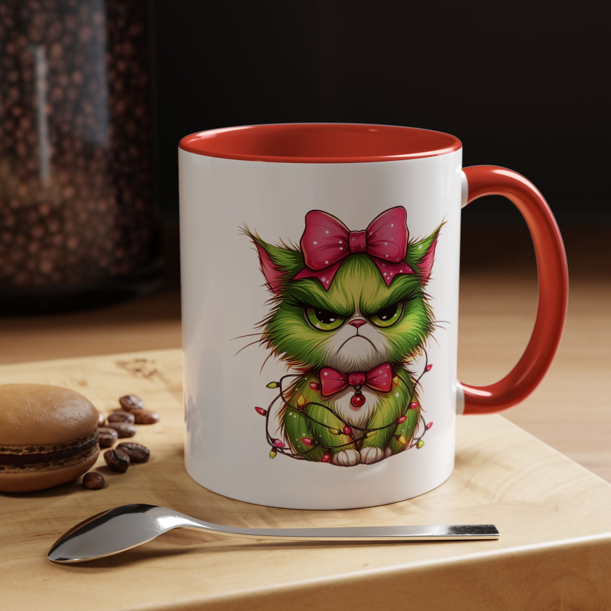 Christmas Grumpy Cat Accent Coffee Mug — Cute Green Kitty with Bow & Holiday Lights (11/15 oz)