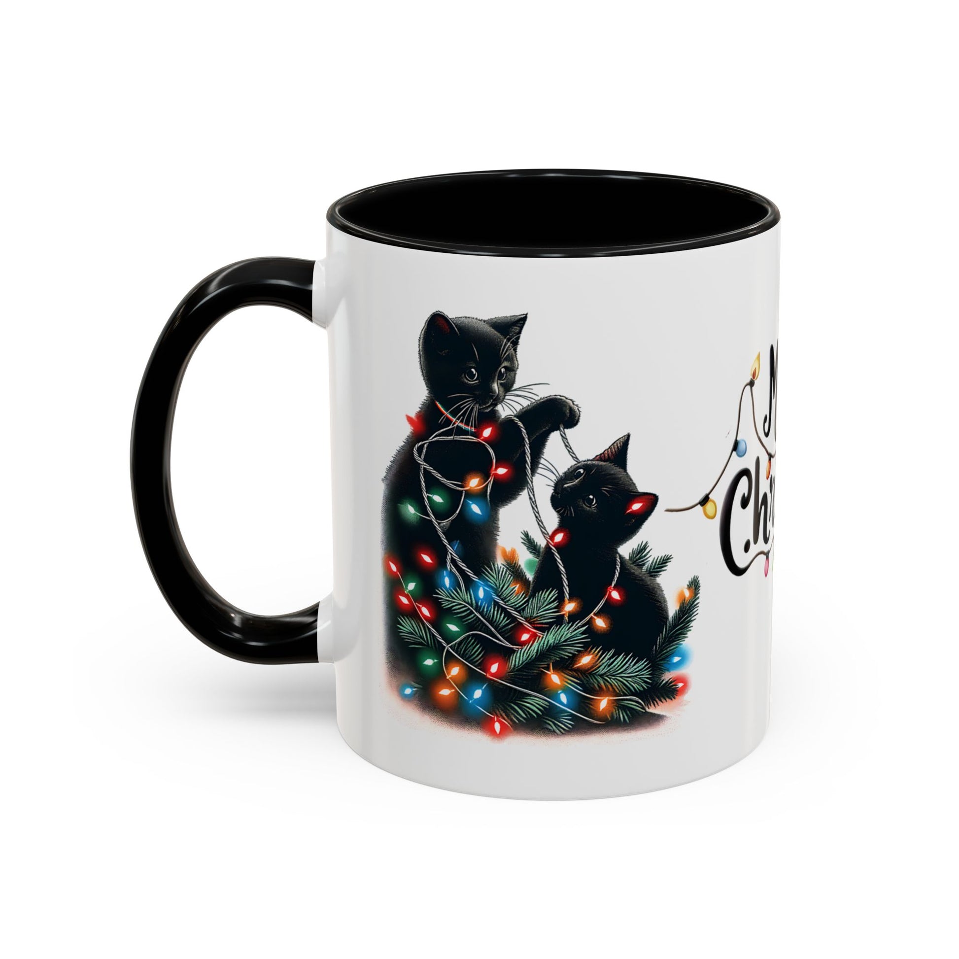 This adorable Christmas mug features playful black cats wrapped in colorful holiday lights, creating the perfect festive vibe for the season. A charming and cozy gift for cat lovers, pet owners, and anyone who enjoys cute Christmas designs. Ideal for morning coffee, hot chocolate, or holiday gift-giving.