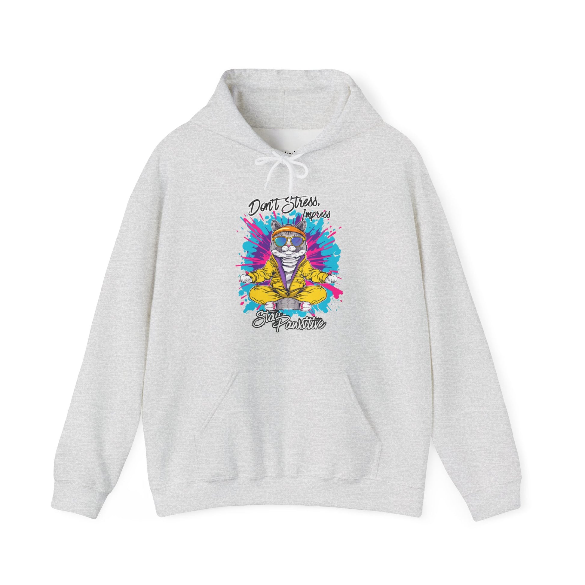 This unisex hoodie features a calm yet confident cat meditating in bright retro colors with the quote “Don’t Stress, Impress” and “Stay Pawsitive.” It’s a perfect mix of positivity, humor, and comfort for cat lovers who enjoy stylish, motivational fashion.