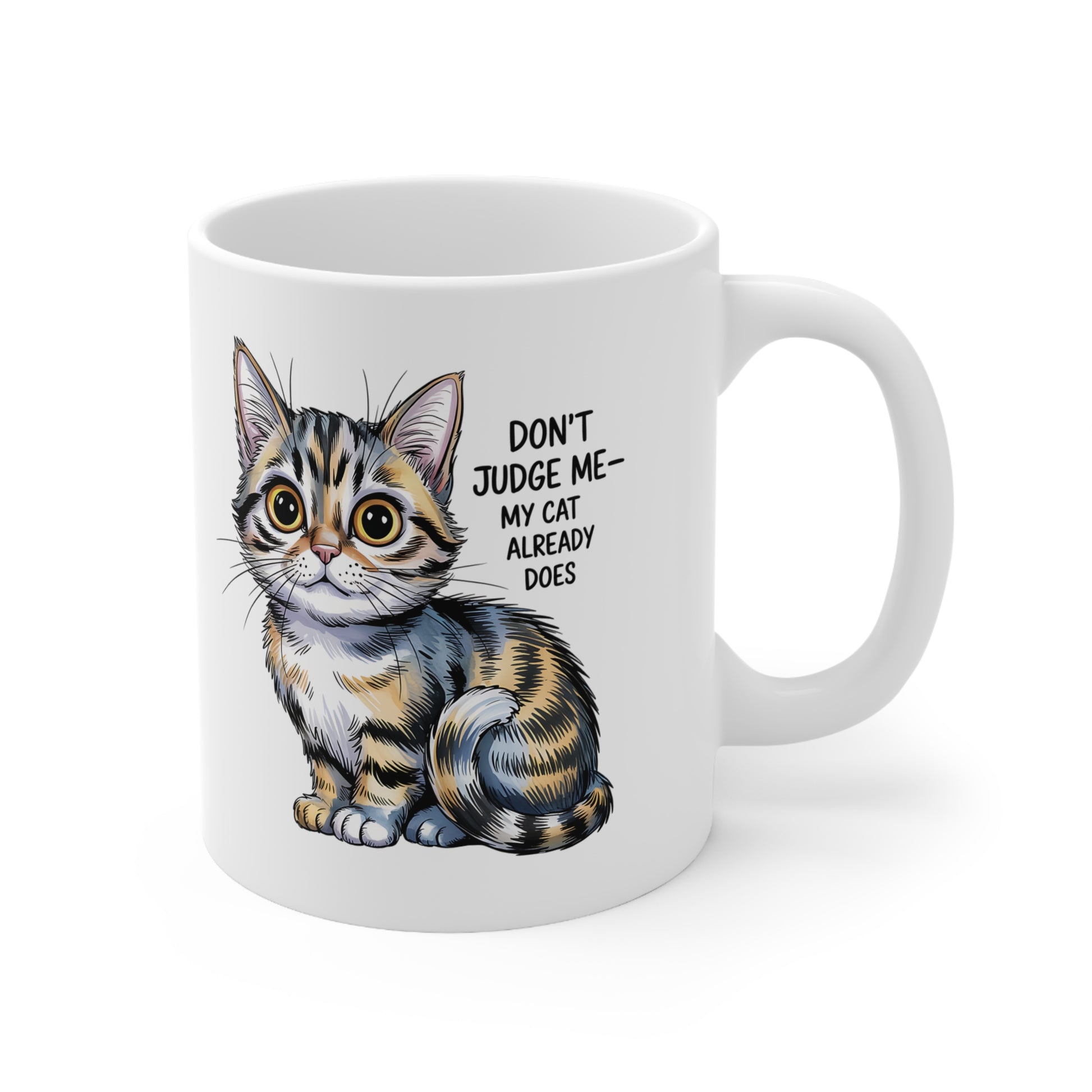 This ceramic mug features a cute kitten illustration with the quote Don't Judge Me, My Cat Already Does. Perfect for cat lovers who enjoy humorous and relatable pet themed designs, this mug makes a fun and expressive daily coffee companion and an excellent gift for birthdays, holidays, or anyone who appreciates playful cat humor.