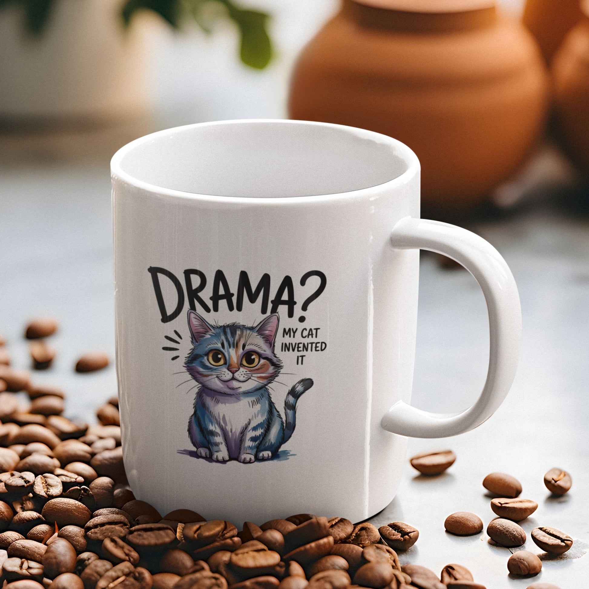 This adorable ceramic mug showcases a cute kitten with the quote Drama My Cat Invented It. Perfect for cat lovers who understand the dramatic and hilarious personality of their pets, this mug makes a fun everyday coffee companion and an ideal gift for birthdays, holidays, or anyone who enjoys playful cat themed humor.