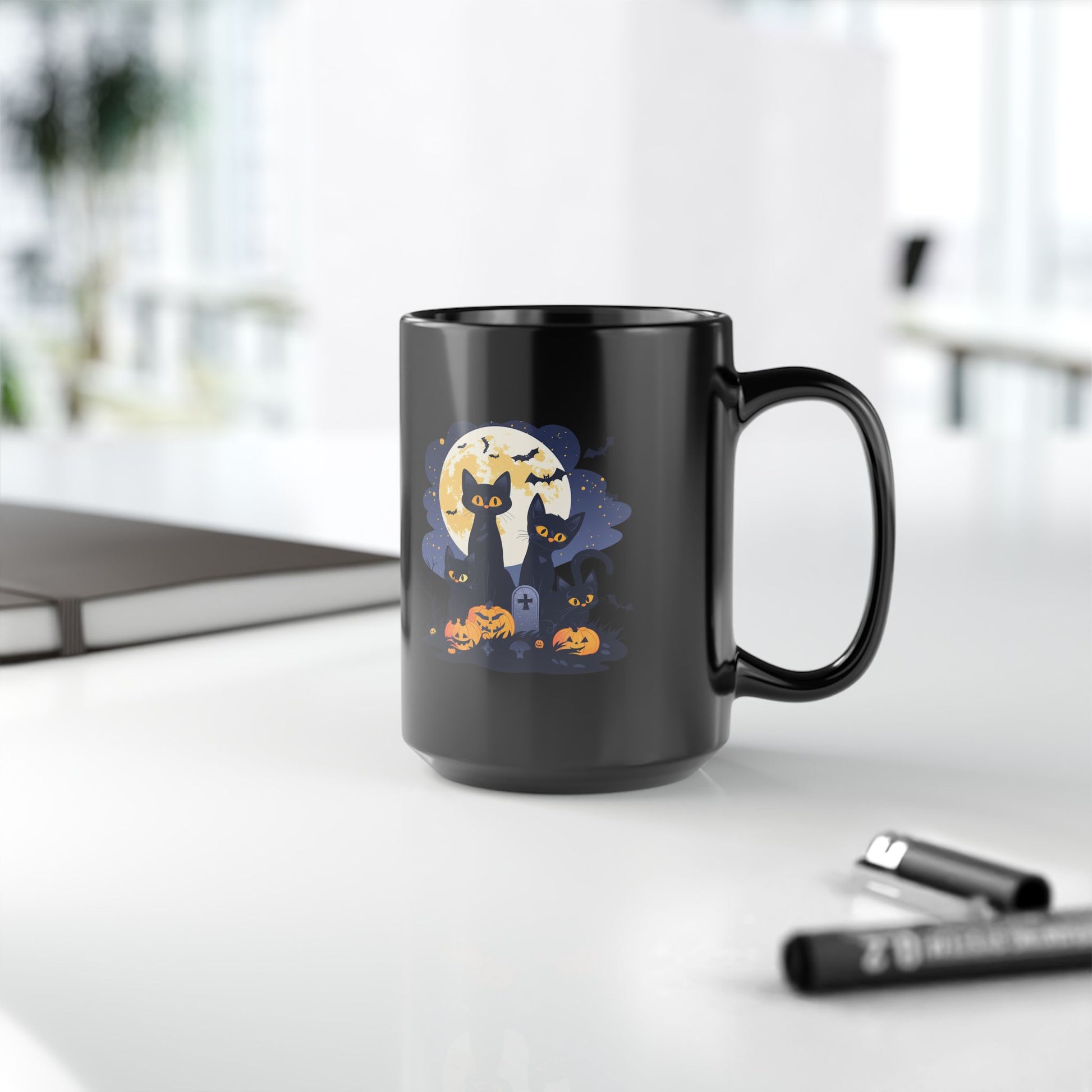 Halloween Black Cat Mug – Spooky Cats with Pumpkins & Full Moon Design