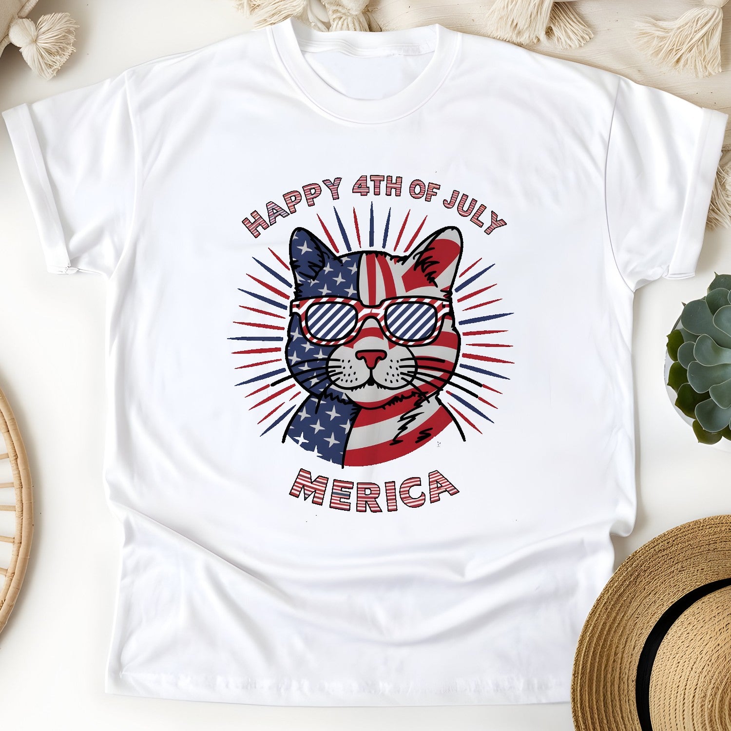 Celebrate Independence Day with this “Happy 4th of July” patriotic cat tee — featuring a funny USA flag design that’s perfect for cat lovers.