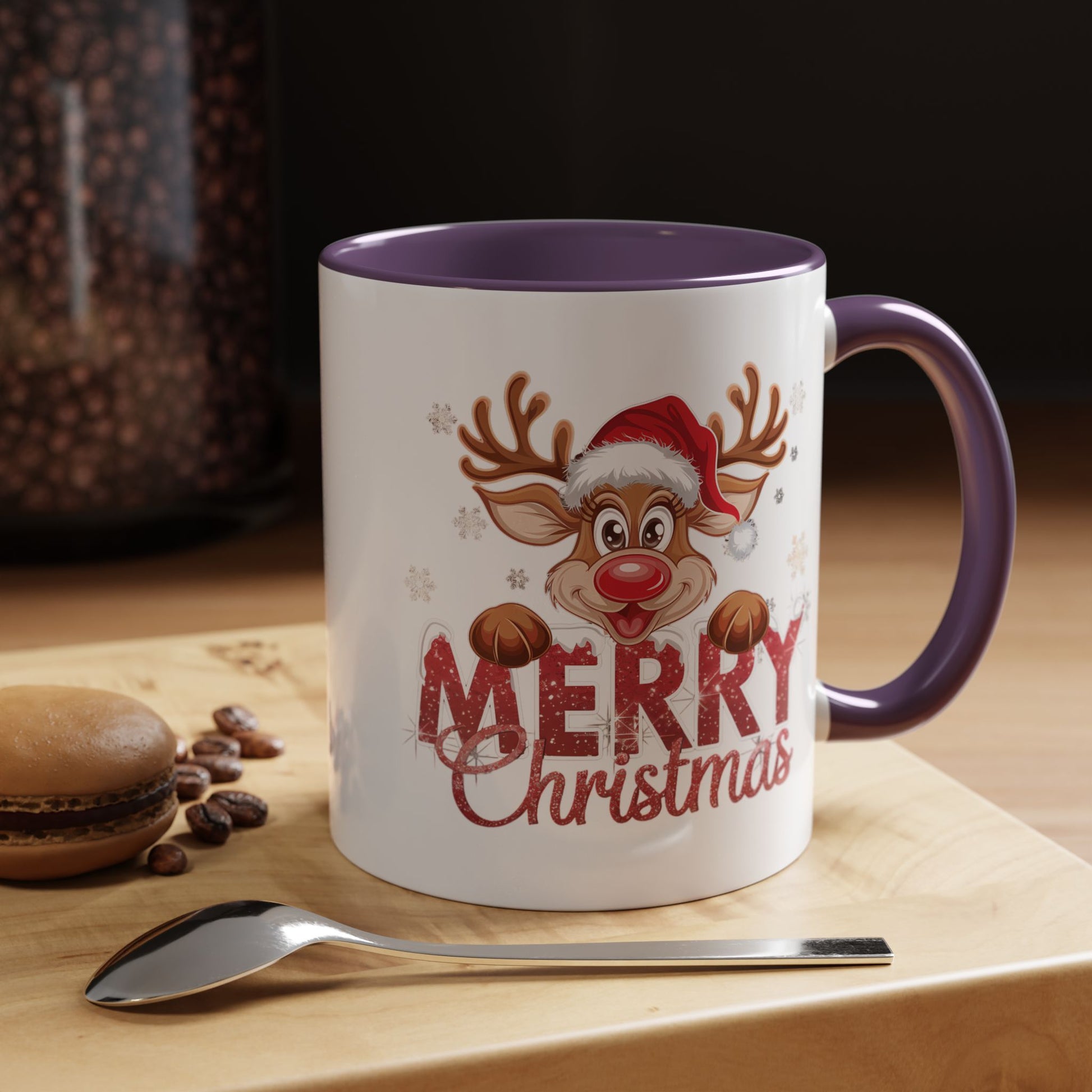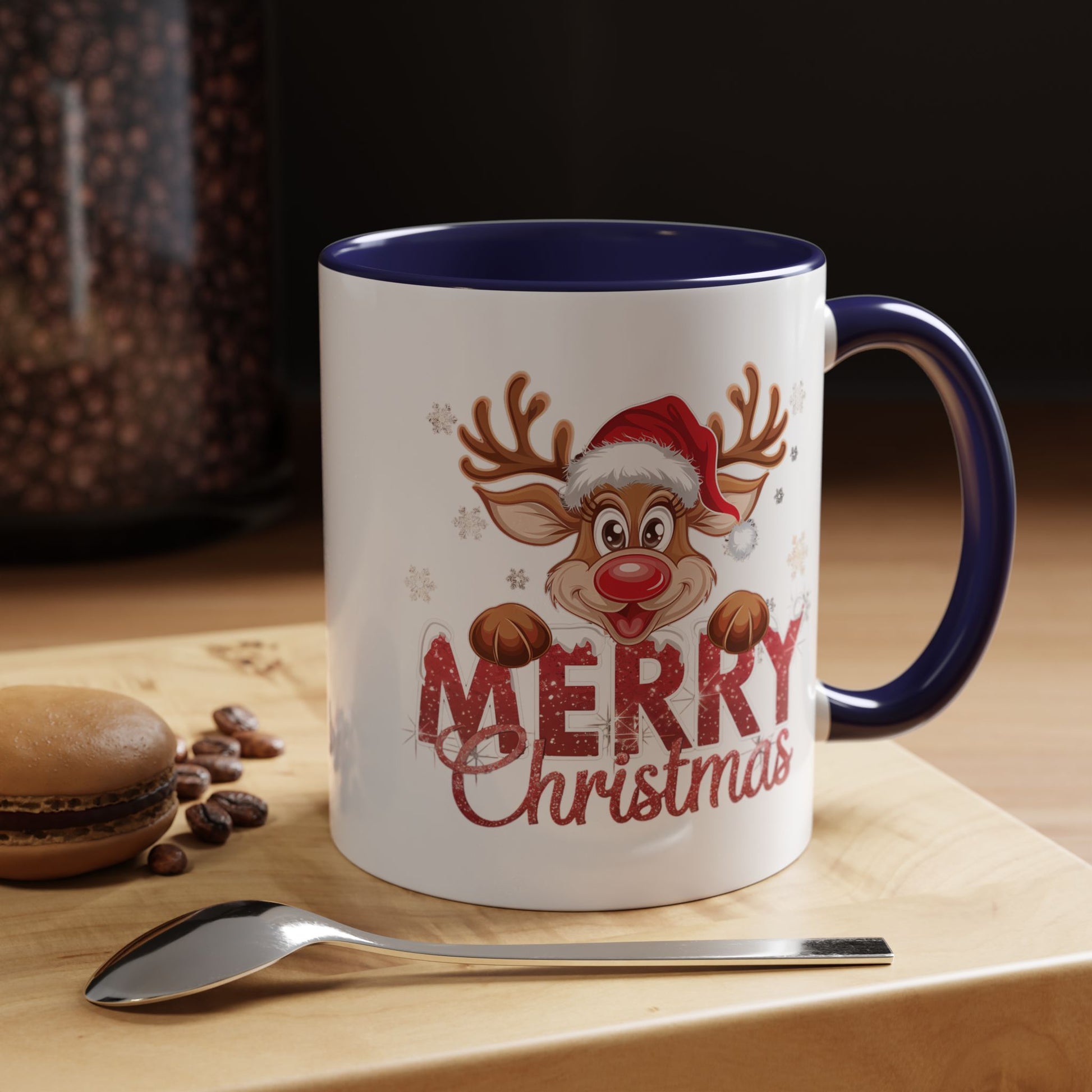 Warm, playful, and full of holiday cheer — this accent mug brings a little festive sparkle to slow mornings and busy gift lists alike. The glossy white ceramic exterior showcases a joyful reindeer wearing a Santa hat and glittery “Merry Christmas” lettering. A contrasting colored interior and C-shaped handle frame the artwork and make each sip feel celebratory. It’s durable for everyday use, bright enough to lift moods, and sized to fit both quick coffee runs and long, cozy breaks by the window.