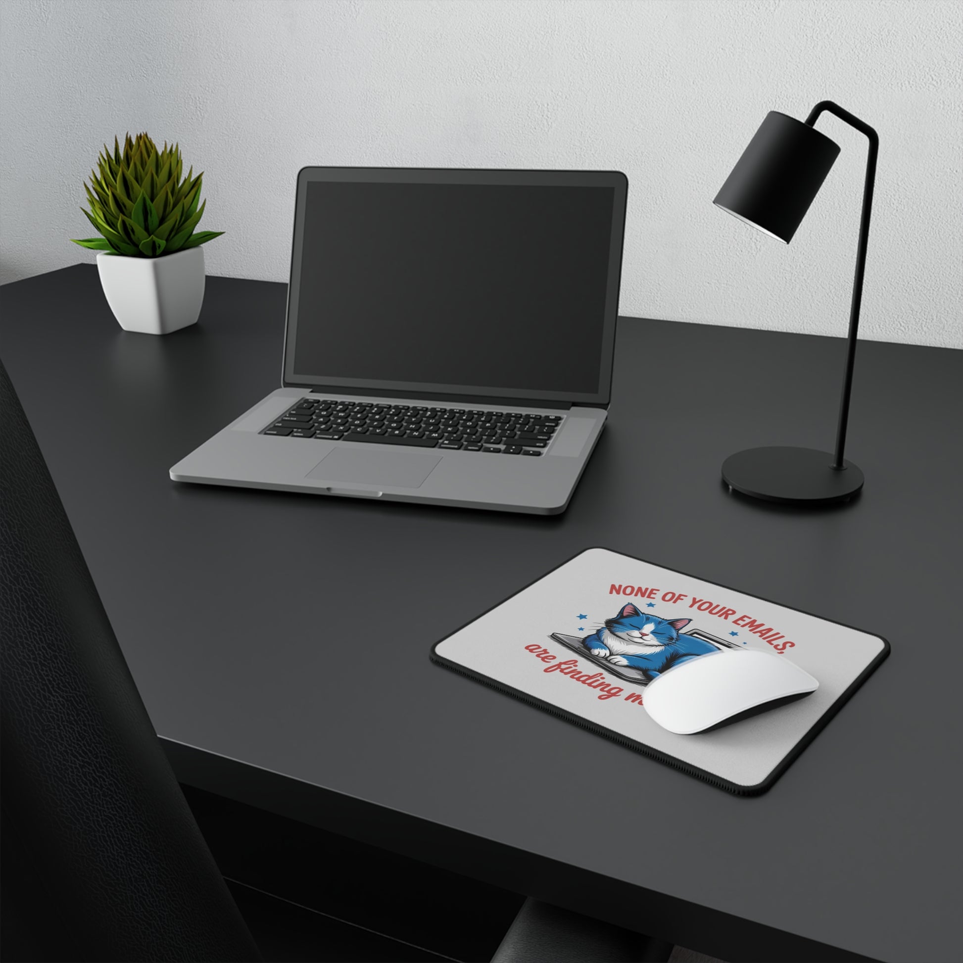 A cozy, cheeky mouse pad that brings a little feline attitude to the desk. Soft polyester top shows a content blue cat curled on a laptop with the phrase “None of your emails are finding me well,” printed in warm, vintage-style tones. The low-profile, smooth surface lets the mouse glide with ease, while the sturdy rubber base keeps everything steady during focused work or late-night gaming. It’s the kind of small, personal touch that makes a workspace feel more like your own — playful, calm, and slightly rebellious against the endless inbox.