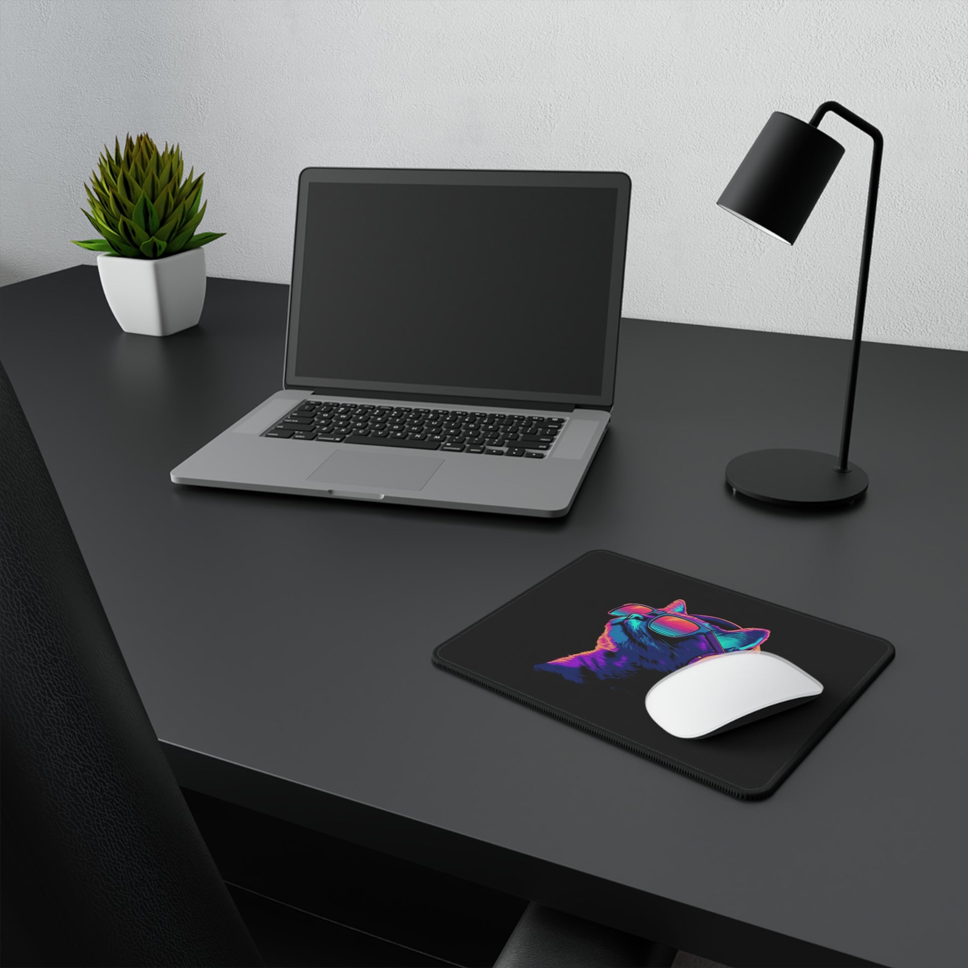 Slide into a neon-lit stream session with this Non-Slip Gaming Mouse Pad. A sleek black field puts a retro-futuristic cat wearing headphones and sunset-gradient shades front and center — bold colors rendered with crisp, fade-resistant printing. The smooth polyester surface lets your mouse glide without hesitation while the natural rubber backing grips the desk so your aim stays steady through long sessions. Thin, low-profile construction with anti-fray edges keeps the pad trim on crowded desks and easy to roll up between setups. It reads like personality for your battlestation: playful, confident, and built to perform night after night.