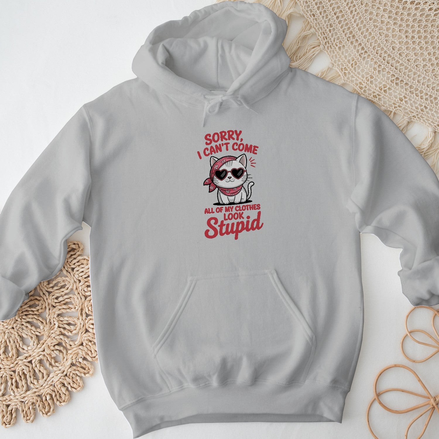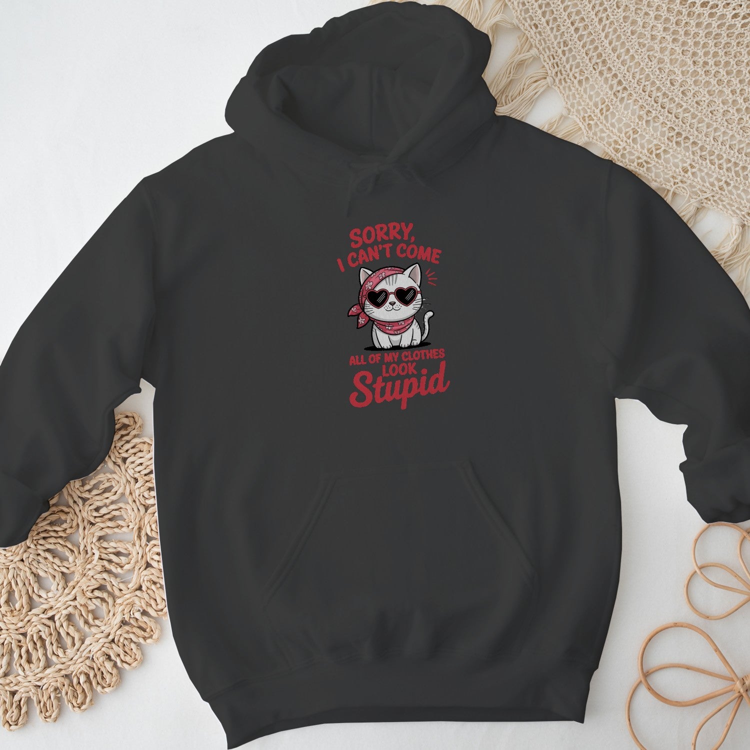 Bring your sass to life with this funny “Sorry I Can’t Come” cat hoodie — a cozy women’s sweatshirt perfect for lazy days, laughs, and cat lovers alike.