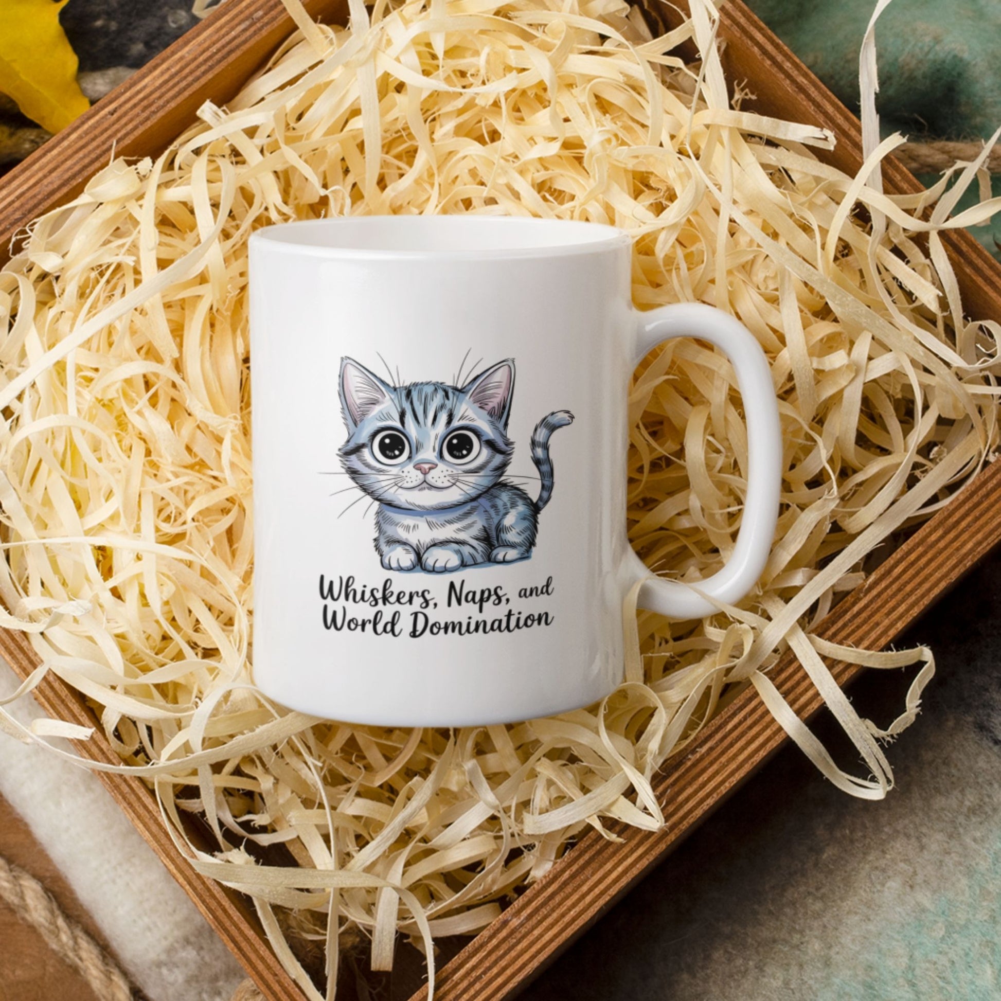 This adorable ceramic mug features a charming kitten illustration with the quote Whiskers, Naps, and World Domination. Designed for cat lovers who appreciate humorous and playful pet themed designs, it makes a fun everyday coffee mug and a unique gift for birthdays, holidays, or anyone who enjoys lighthearted cat humor.