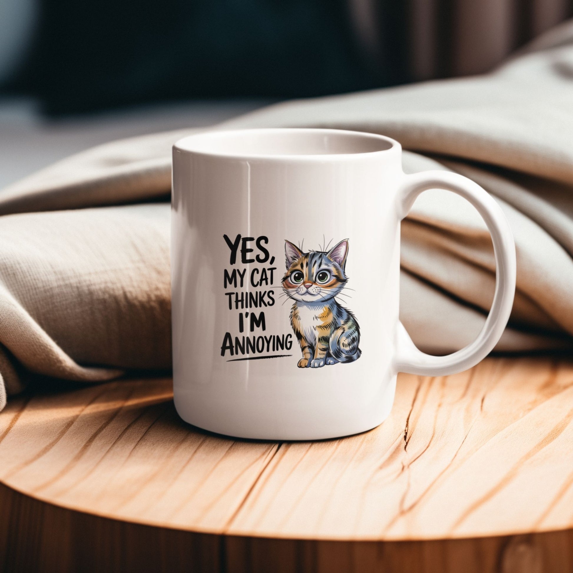 This ceramic mug features a cute kitten illustration with the quote Yes, My Cat Thinks I Am Annoying. Perfect for cat lovers who appreciate honest and humorous pet themed designs, this mug makes a fun and relatable everyday coffee companion and an ideal gift for birthdays, holidays, or anyone who enjoys lighthearted cat humor.